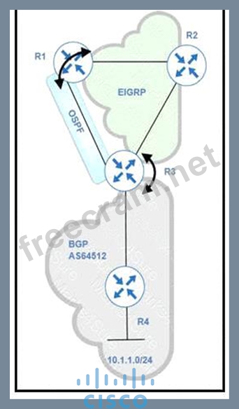 After redistribution, R3 learns about network 10.1.1.0/24 via two paths: + Internal BGP (IBGP): advertised from R4 with AD of 200 (and metric of 0) + OSPF: advertised from R1 with AD of 110 (O E2) (and metric of 20) Therefore R3 will choose the path with the lower AD via OSPF But this is a looped path which is received from R3 -> R2 -> R1 -> R3. So when the advertised route from R4 is expired, the looped path is also expired soon and R3 will reinstall the main path from R4. This is the cause of intermittent connectivity. We can solve this problem by denying the 10.1.1.0/24 prefix from being redistributed into OSPF on R1. So R3 will not learn this prefix from R1. Or another solution is to place an OSPF distribute-list inbound on R3 to block the 10.1.1.0/24 prefix from being advertised back to R3.