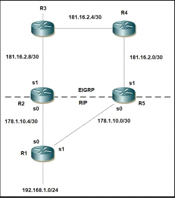 Mutual redistribution is enabled between RIP and EIGRP on R2 and R5. Which configuration resolves the routing loop for the 192.168.1.0/24 network?