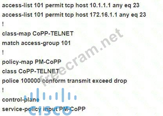 The network administrator configured R1 for Control Plane Policing so that the inbound Telnet traffic is policed to 100 kbps. This policy must not apply to traffic coming in from 10.1.1.1/32 and 172.16.1.1/32. The administrator has configured this: