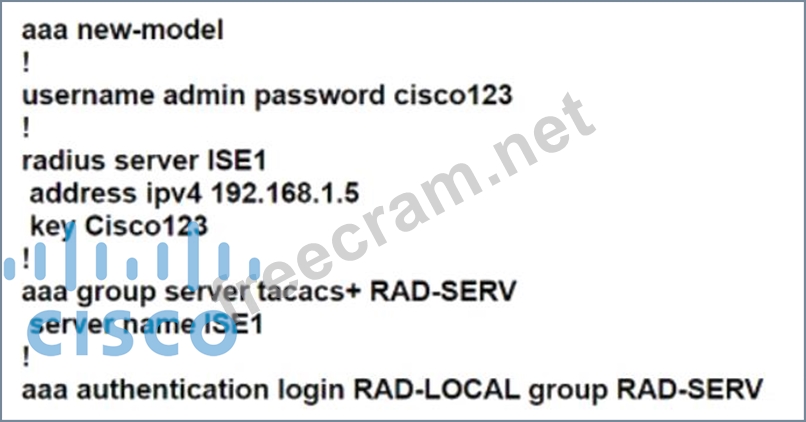 The network administrator is tasked to configure R1 to authenticate telnet connections based on Cisco ISE using RADIUS. ISE has been configured with an IP address of 192.168.1.5 and with a network device pointing towards R1 (192.168.1.1) with a shared secret password of Cisco123. If ISE is down, the administrator should be able to connect using the local database with a username and password combination of admin/cisco123.