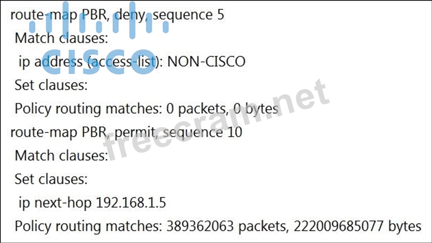 In the sequence 5 of route-map PBR, all the packets matched access-list NON-CISCO will be dropped (by "deny" statement). But from the "Policy routing matches: 0 packets, 0 bytes" line, we can deduce no packets have been dropped so far. In the sequence 10 of route-map PBR, if a match command is not present then all routes match the clause. Therefore all other packets will be matched by sequence 10 and they are forwarded to the default gateway 192.168.1.5. https://www.cisco.com/c/en/us/support/docs/ip/ip-routed-protocols/47121-pbr-cmds-ce.html