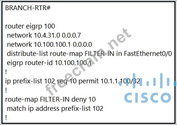 Refer to the exhibit. A junior engineer updated a branch router configuration. Immediately after the change, the engineer receives calls from the help desk that branch personnel cannot reach any network destinations. Which configuration restores service and continues to block 10.1.1.100/32?