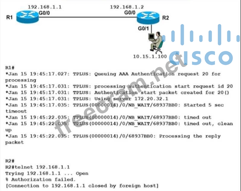 Refer to the exhibit. A network engineer is troubleshooting an AAA authentication issue for R1 from R2. When an engineer tries to open a telnet connection to R1 it opens the connection but shows a %Authorization failed error message on the terminal and closes the connection silently.