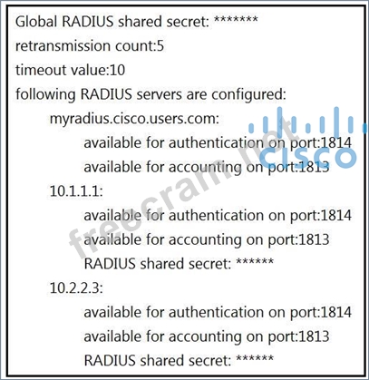 By default, RADIUS uses UDP port 1812 for authentication and port 1813 for accounting. In the exhibit above we see port 1814 is being used for authentication to AAA server at 10.1.1.1 which is not the default port so we must adjust the authentication port to the default value 1812.