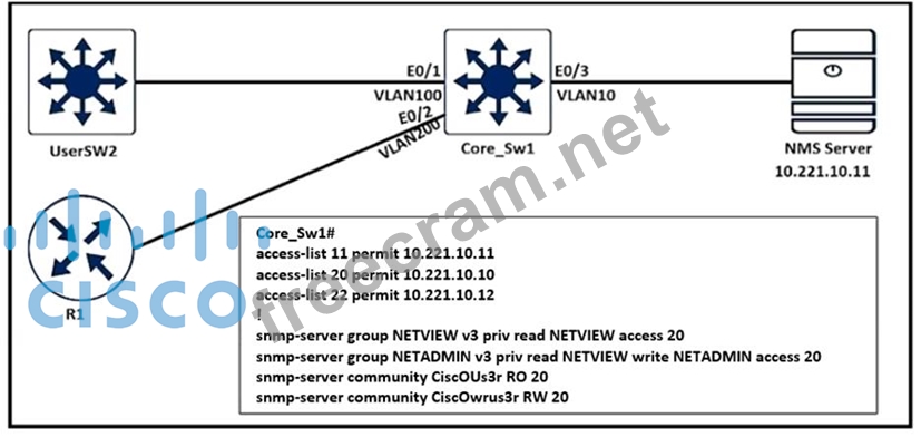 Refer to the exhibit. An engineer configured SNMP communities on the Core Sw1, but the SNMP server cannot obtain information from Core_Sw1. Which configuration resolves this issue?