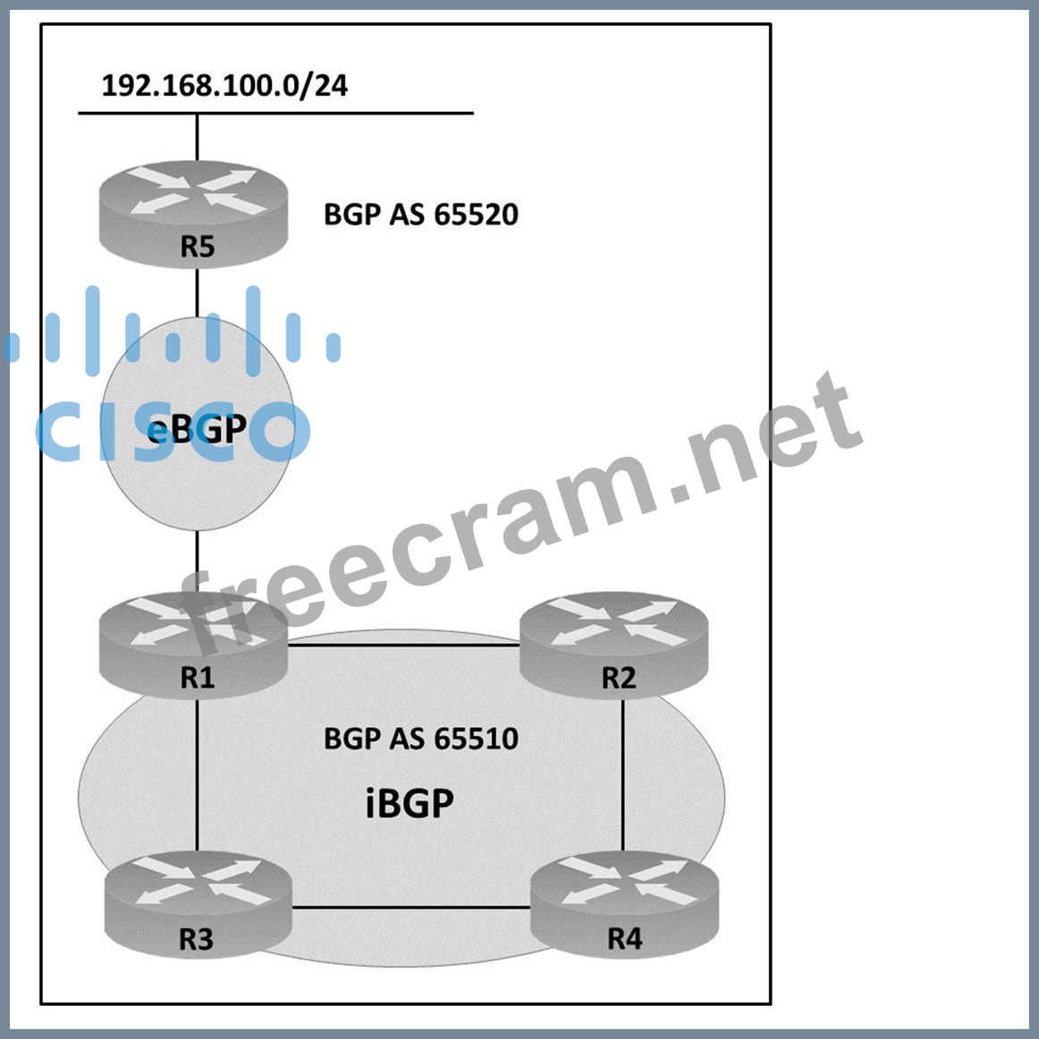 Refer to the exhibit. AS65510 iBGP is configured for directly connected neighbors. R4 cannot ping or traceroute network 192.168.100.0/24.