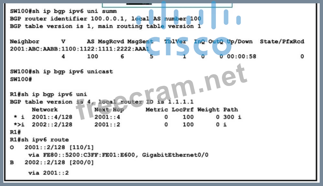 Question 263: Refer to the exhibit. SW100 cannot receive routes from R1. W...