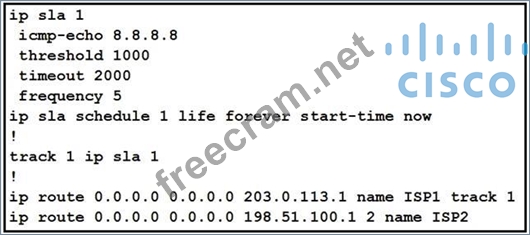 With this configuration, when Track 1 is UP, traffic to the Internet (8.8.8.8 is the well-known DNS of Google) flows through ISP1. When Track 1 is DOWN, traffic to the Internet flows through ISP