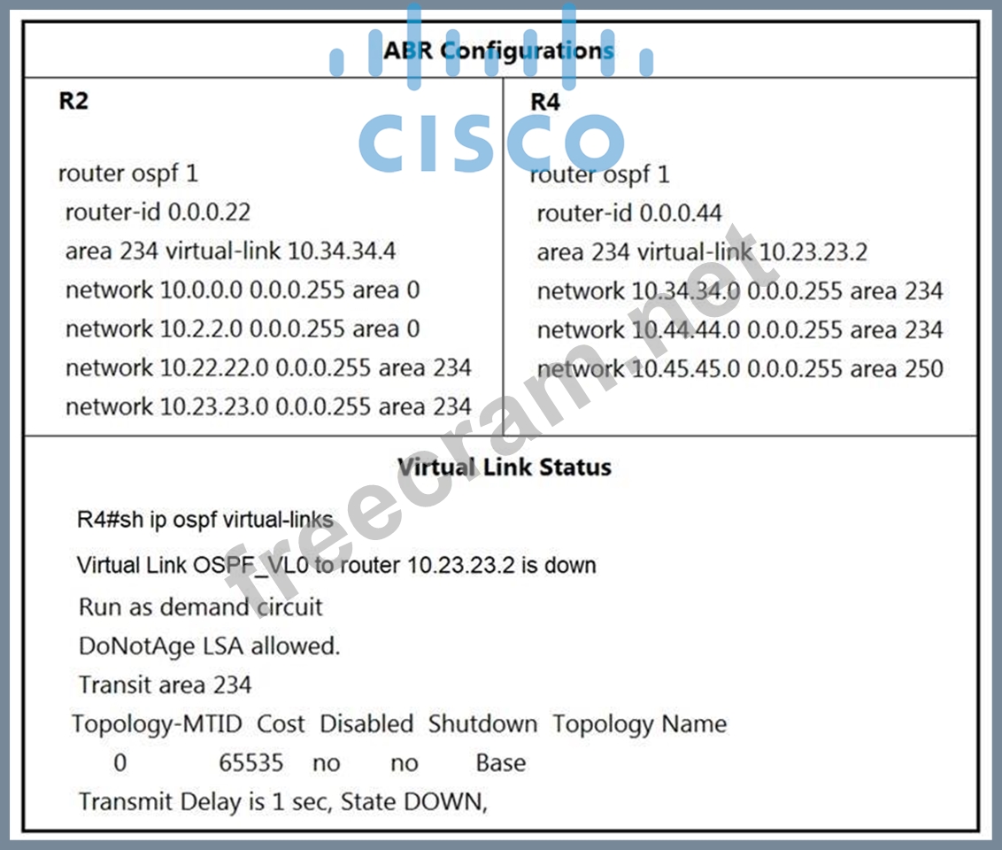 Refer to the exhibit. The network administrator configured the network to connect two disjointed networks and ail the connectivity is up except the virtual link which causes area 250 to be unreachable. Which two configurations resolve this issue? (Choose two.)