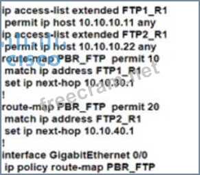 Refer to the exhibit. The R1 routing table has the prefixes for the FTP1 and FTP2 file servers. A network engineer must configure the R1 with these requirements: