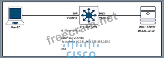 Refer to the exhibit. Users in VLAN46 cannot get the IP from the DHCP server. Assume that all the parameters are configured properly in VLAN 10 and on the DHCP server Which command on interlace VLAN46 allows users to receive IP from the DHCP server?