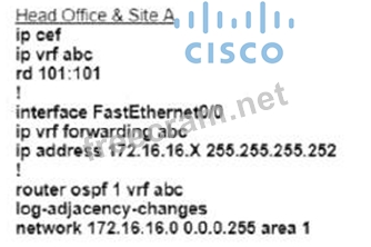 An engineer configured a company's multiple area OSPF head office router and Site A cisco routers with VRF lite. Each site router is connected to a PE router of an MPLS backbone.