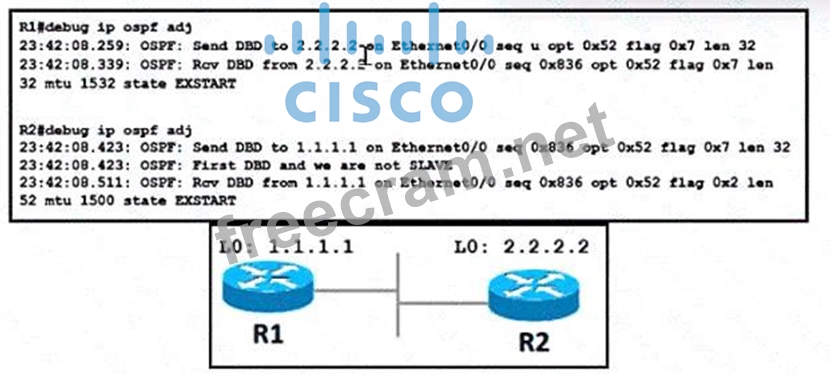 In OSPF (Open Shortest Path First), the MTU (Maximum Transmission Unit) size must match on both sides of a link for OSPF neighbors to form an adjacency12. If the MTU sizes do not match, the OSPF adjacency will not form, and the routers will not become neighbors12. In this case, R1 cannot establish a neighbor relationship with R2. One possible reason for this could be a mismatch in the MTU size on the interfaces of R1 and R212. To resolve this issue, you can configure the mtu ignore command on the interfaces of R1 and R2 (Option A). This command allows OSPF to ignore the MTU size when determining if it can form an adjacency with a neighbor12. This means that even if the MTU sizes do not match, OSPF will still form an adjacency, and R1 and R2 will become neighbors12. References: OSPF MTU Mismatch - NetworkLessons.com Understanding OSPF MTU Mismatch Conditions and Solutions - Cisco