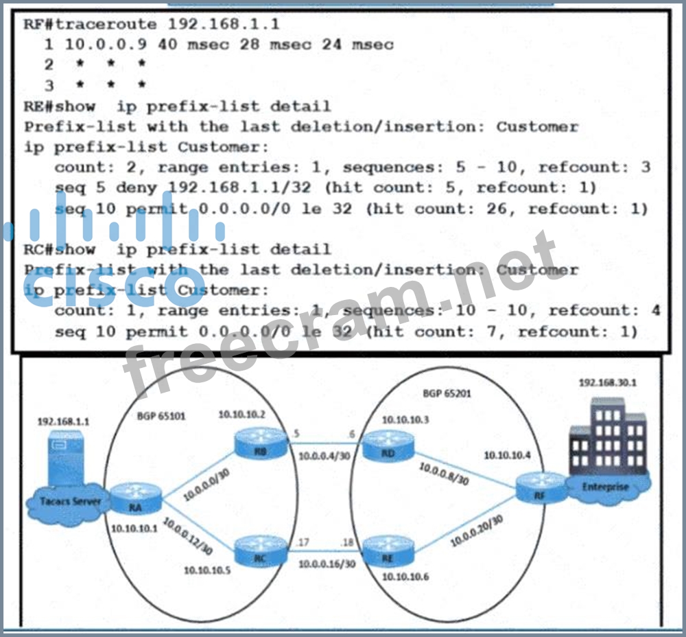 Refer to the exhibit The enterprise users fail to authenticate with the TACACS server when a direct fiber link fails between RB and RD The NOC team observes Users connected on AS65201 fail to authenticate with TACACS server 192 168 1 1 Users connected on AS65101 successfully authenticate with TACACS server 192 168 1 1 All AS65101 and AS65201 users are configured to authenticate with the TACACS server Which configuration resolves the issue?