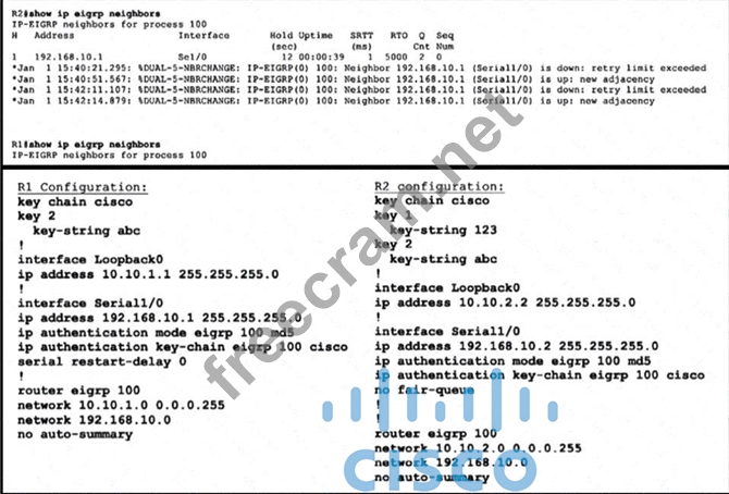 R1 and R2 are configured for EIGRP peering using authentication and the neighbors failed to come up. Which action resolves the issue?