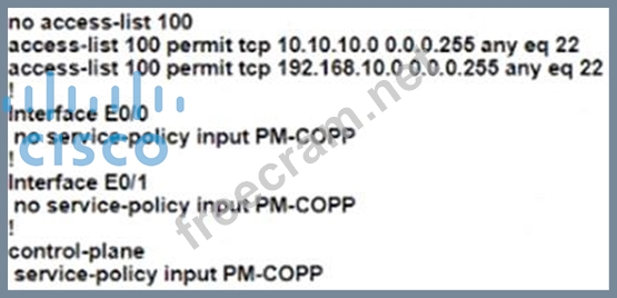 The network administrator configured the router for Control Plane Policrg so that inbound SSH traffic is policed to 500 kbps This policy must apply to traffic coming in from 101010 0<24 and 192 168 10.0/24 networks