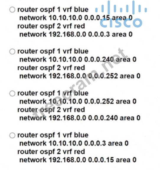 An engineer configured VRF-Lite on a router for VRF blue and VRF red. OSPF must be enabled on each VRF to peer to a directly connected router in each VRF. Which configuration forms OSPF neighbors over the network 10.10.10.0/28 for VRF blue and 192.168.0.0/30 for VRF red?