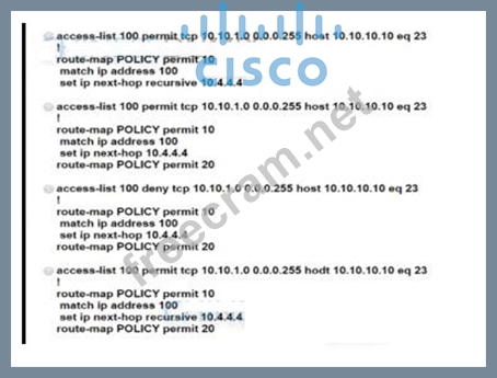 10.10.10.10 from 10.10.1.0/24 via a next hop of 10.4.4.4. which is directly connected to the router that is connected to the 10.1.1.0/24 subnet Which configuration reroutes traffic according to this requirement?