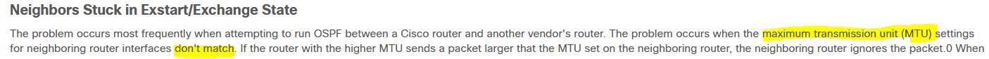 An engineer needs dynamic routing between two routers and is unable to establish OSPF adjacency. The output of the show ip ospf neighbor command shows that the neighbor state is EXSTART/EXCHANGE.