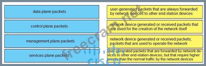 Unlike legacy network technologies such as ISDN, Frame Relay, and ATM that defined separate data and control channels, IP carries all packets within a single pipe. Thus, IP network devices such as routers and switches must be able to distinguish between data plane, control plane, and management plane packets to treat each packet appropriately.From an IP traffic plane perspective, packets may be divided into four distinct, logical groups:1. Data plane packets - End-station, user-generated packets that are always forwarded by network devices to other end-station devices. From the perspective of the network device, data plane packets always have a transit destination IP address and can be handled by normal, destination IP address-based forwarding processes.2. Control plane packets - Network device generated or received packets that are used for the creation and operation of the network itself. From the perspective of the network device, control plane packets always have a receive destination IP address and are handled by the CPU in the network device route processor. Examples include protocols such as ARP, BGP, OSPF, and other protocols that glue the network together.3. Management plane packets - Network device generated or received packets, or management station generated or received packets that are used to manage the network. From the perspective of the network device, management plane packets always have a receive destination IP address and are handled by the CPU in the network device route processor. Examples include protocols such as Telnet,Secure Shell (SSH), TFTP, SNMP, FTP, NTP, and other protocols used to manage the device and/or network.4. Services plane packets - A special case of data plane packets, services plane packets are also user-generated packets that are also forwarded by network devices to other end-station devices, but that require high-touch handling by the network device (above and beyond normal, destination IP address-based forwarding) to forward the packet. Examples of high-touch handling include such functions as GRE encapsulation, QoS, MPLS VPNs, and SSL/IPsec encryption/decryption, etc. From the perspective of the network device, services plane packets may have a transit destination IP address, or may have a receive destination IP address (for example, in the case of a VPN tunnel endpoint).