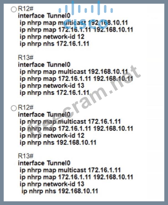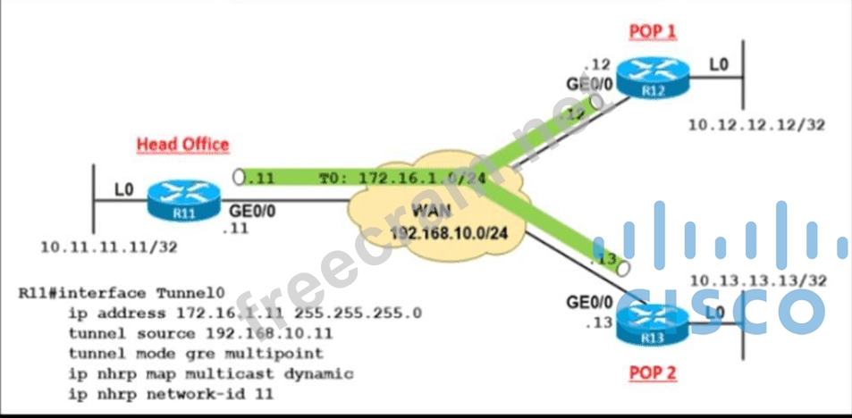 Refer to the exhibit A company builds WAN infrastructure between the head office and POPs using DMVPN hub-and-spoke topology to provide end-to-end communication All POPs must maintain point-to-point connectivity with the head office Which configuration meets the requirement at routers R12 and R13?