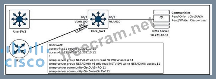 Refer to the exhibit. An engineer configured SNMP Commimes on UserSW2 switch, but the SNMP server cannot upload modified configurations to the switch. Which configuration resolves this issue?
