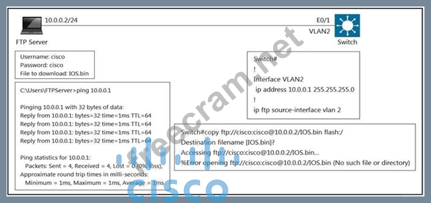 An engineer cannot copy the IOS.bin file from the FTP server to the switch.