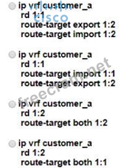 The network administrator configured VRF lite for customer A. The technician at the remote site misconfigured VRF on the router. Which configuration will resolve connectivity for both sites of customer_a?