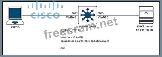 Users in VLAN46 cannot get the IP from the DHCP server. Assume that all the parameters are configured properly in VLAN 10 and on the DHCP server Which command on interlace VLAN46 allows users to receive IP from the DHCP server?