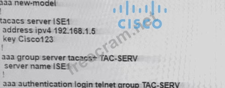 The network administrator configured R1 to authenticate Telnet connections based on Cisco ISE using TACACS+. ISE has been configured with an IP address of 192.168.1.5 and with a network device pointing toward R1(192.168.1.1) with a shared secret password of Cisco123. The administrator cannot authenticate to R1 based on ISE. Which configuration fixes the issue?