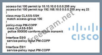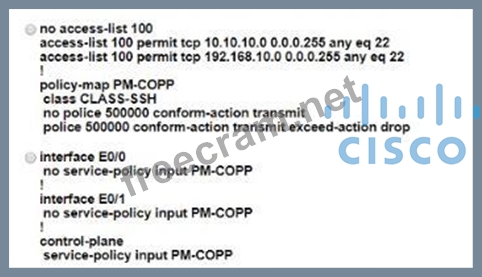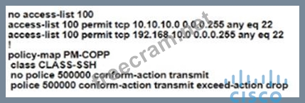 The network administrator configured the router for Control Plane Policrg so that inbound SSH traffic is policed to 500 kbps This policy must apply to traffic coming in from 101010 0<24 and 192 168 10.0/24 networks