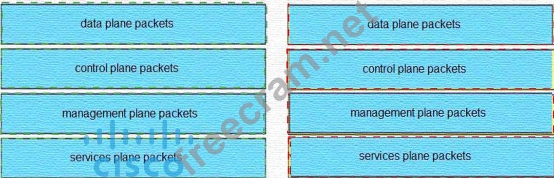 Unlike legacy network technologies such as ISDN, Frame Relay, and ATM that defined separate data and control channels, IP carries all packets within a single pipe. Thus, IP network devices such as routers and switches must be able to distinguish between data plane, control plane, and management plane packets to treat each packet appropriately.From an IP traffic plane perspective, packets may be divided into four distinct, logical groups:1. Data plane packets - End-station, user-generated packets that are always forwarded by network devices to other end-station devices. From the perspective of the network device, data plane packets always have a transit destination IP address and can be handled by normal, destination IP address-based forwarding processes.2. Control plane packets - Network device generated or received packets that are used for the creation and operation of the network itself. From the perspective of the network device, control plane packets always have a receive destination IP address and are handled by the CPU in the network device route processor. Examples include protocols such as ARP, BGP, OSPF, and other protocols that glue the network together.3. Management plane packets - Network device generated or received packets, or management station generated or received packets that are used to manage the network. From the perspective of the network device, management plane packets always have a receive destination IP address and are handled by the CPU in the network device route processor. Examples include protocols such as Telnet,Secure Shell (SSH), TFTP, SNMP, FTP, NTP, and other protocols used to manage the device and/or network.4. Services plane packets - A special case of data plane packets, services plane packets are also user-generated packets that are also forwarded by network devices to other end-station devices, but that require high-touch handling by the network device (above and beyond normal, destination IP address-based forwarding) to forward the packet. Examples of high-touch handling include such functions as GRE encapsulation, QoS, MPLS VPNs, and SSL/IPsec encryption/decryption, etc. From the perspective of the network device, services plane packets may have a transit destination IP address, or may have a receive destination IP address (for example, in the case of a VPN tunnel endpoint).