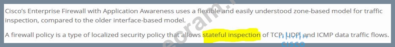 A network administrator is configuring an application-aware firewall between inside zones to an outside zone on a WAN edge router using vManage GUI. What kind of Inspection is performed when the ''inspect'' action is used?