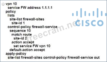 An engineer is configuring service chaining. Which set of configurations is required for all traffic from Site ID 1 going toward Site ID 2 to get filtered through the firewall on the hub site?