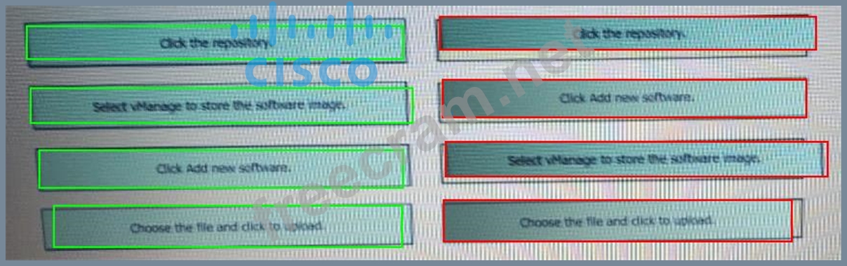 Drag and drop the steps from the left into the order on the right to upload software on vManage repository that is accessible from maintenance > Software Repository.