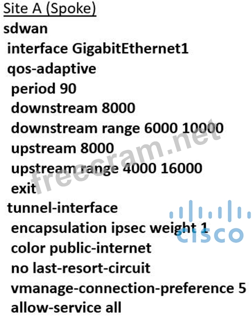Refer to the exhibit. An engineer must configure a QoS policy between the hub and site A (spoke) over a standard Internet circuit where traffic shaping is adjusted based on available bandwidth.