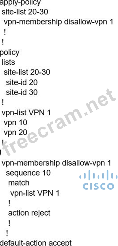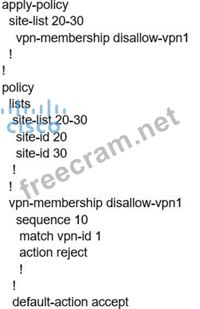 When the VPN membership policy is being controlled at the vSmart controller, which policy disallows VPN 1 at sites 20 and 30?