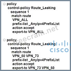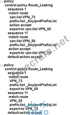 An enterprise has several sites with multiple VPNs that are isolated from each other A new requirement came where users in VPN 73 must be able to talk to users in VPN 50 Which configuration meets this requirement?