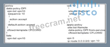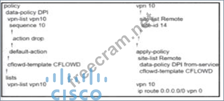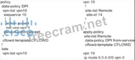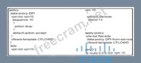 To allow VPN 10 traffic to have direct internet access locally from the WAN Edge device, the configuration must ensure that the traffic is routed correctly and that NAT (Network Address Translation) is applied to allow the traffic to exit to the internet. * Policy Configuration: * NAT Use: The configuration should include a directive to use NAT for the specific VPN (VPN 10 in this case). This ensures that the traffic originating from VPN 10 can be translated and routed to the internet. * Apply Policy: The policy should be applied in the outbound direction to the appropriate interface that connects to the internet. * Option A Analysis: * This option includes the nat use-vpn 0 directive, which instructs the system to use NAT for traffic in VPN 10, allowing it to access the internet directly. * The apply-policy command is correctly used to apply the policy to the site list and the data-policy DPI from-service. * References: * Cisco SD-WAN NAT Configuration Guide * Cisco SD-WAN Direct Internet Access (DIA) Configuration Documentation