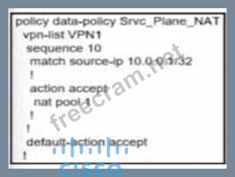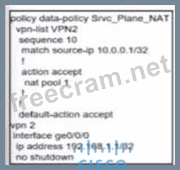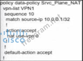 When dealing with overlapping IP addresses in different branch sites, it's crucial to use NAT (Network Address Translation) to avoid IP conflicts and establish proper communication. * NAT Configuration: * Source NAT: This involves translating the source IP addresses of the packets as they leave a specific interface. This can help avoid IP conflicts by ensuring that the IP addresses used within the network are unique. * Data Policy: A data policy must be created that matches the source IP addresses and applies the NAT pool to translate these addresses. * Option A Analysis: * Policy Definition: The data policy Srvc_Plane_NAT includes a sequence that matches the source IP 10.0.0.1/32 and accepts the action to apply NAT using nat pool 1. * Interface Configuration: The interface ge0/0/0 is configured with the IP address 192.168.1.1/32 and is not shut down, ensuring it is active and can handle the NAT translation.