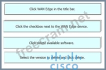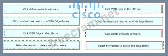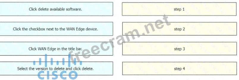 Drag and drop the steps from the left Into the order on the right to delete a software image for a WAN Edge router starting with Maintenance > Software Upgrade > Device list on vManage.