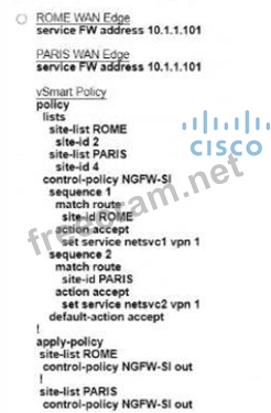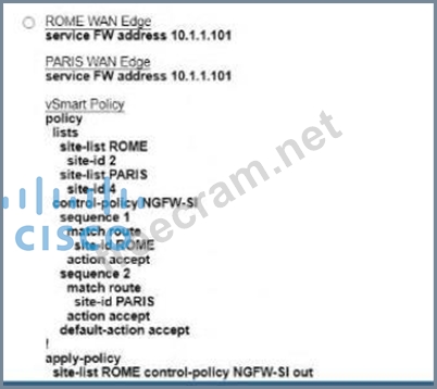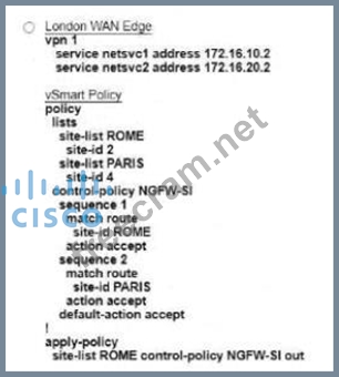 Refer to the exhibit. The Cisco SD-VYAN is deployed using the default topology. The engineer v/ants to configure a service insertion policy such that all data traffic between Rome to Paris is forwarded through the NGFW located in London. Which configuration fulfills this requirement, assuming that the Sen/ice VPN ID is