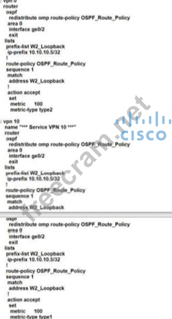 A customer is receiving routes via OMP from vSmart controller for a specific VPN. The customer must provide access to the W2 loopback received via OMP to the OSPF neighbor on the service-side VPN, which configuration fulfils these requirements?
