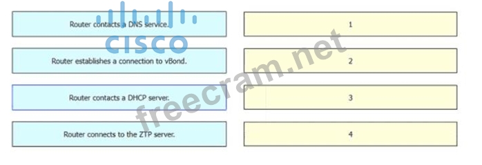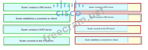 Drag and drop the steps from the left into the sequence on the right for a WAN Edge router after powering on for zero touch provisioning.