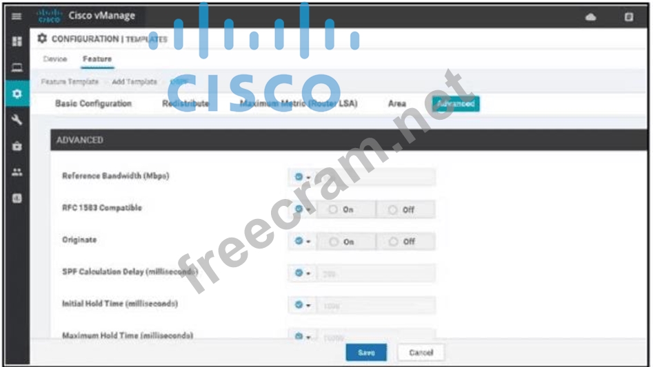 Refer to the exhibit. A network administrator is configuring OSPF advanced configuration pararmeters from a template using the vManager GUI for a branch WAN Edge router to calculate the cost of summary routes to an ASBR. Which action achieves this configuration?