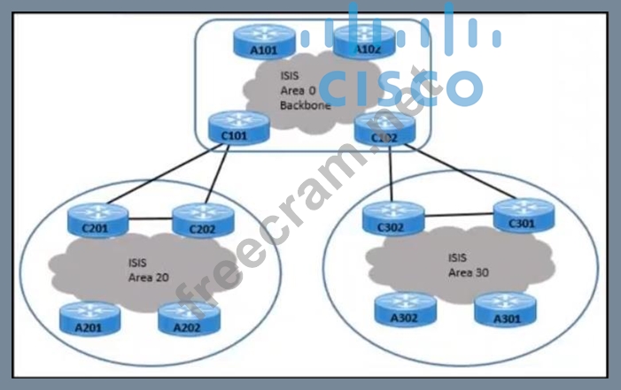 Refer to the exhibit. An architect is designing a hierarchical ISIS solution for a customer with these requirements: - Routers will double in all areas within the next 24 months. - Link flaps within areas 20 and 30 must not impact the backbone area. - Traffic originating from A201 and A302 routers must connect to application servers in the backbone. Which design must the architect select?