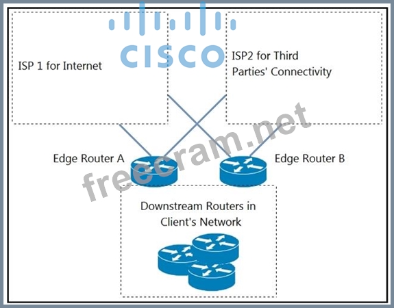 Refer to the exhibit. An engineer is designing a BGP solution for a client that peers with ISP1 for full Internet connectivity and with ISP2 for direct exchange of routes for several third parties.
