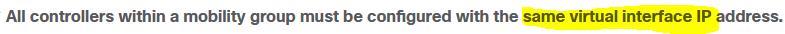 An engineer must configure the virtual IP address on multiple controllers in a mobility group. Which rule must the engineer follows to ensure proper roaming?