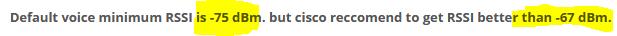 A wireless engineer is utilizing the voice readiness tool in Cisco Prime for a customer that wants to deploy Cisco IP phones. Which dBm range is the network inspected against?