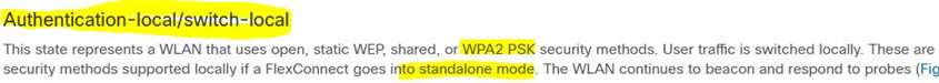 Branch wireless users report that they can no longer access services from head office but can access services locally at the site. New wireless users can associate to the wireless while the WAN is down. Which three elements (Cisco FlexConnect state, operation mode, and authentication method) are seen in this scenario? (Choose three.)